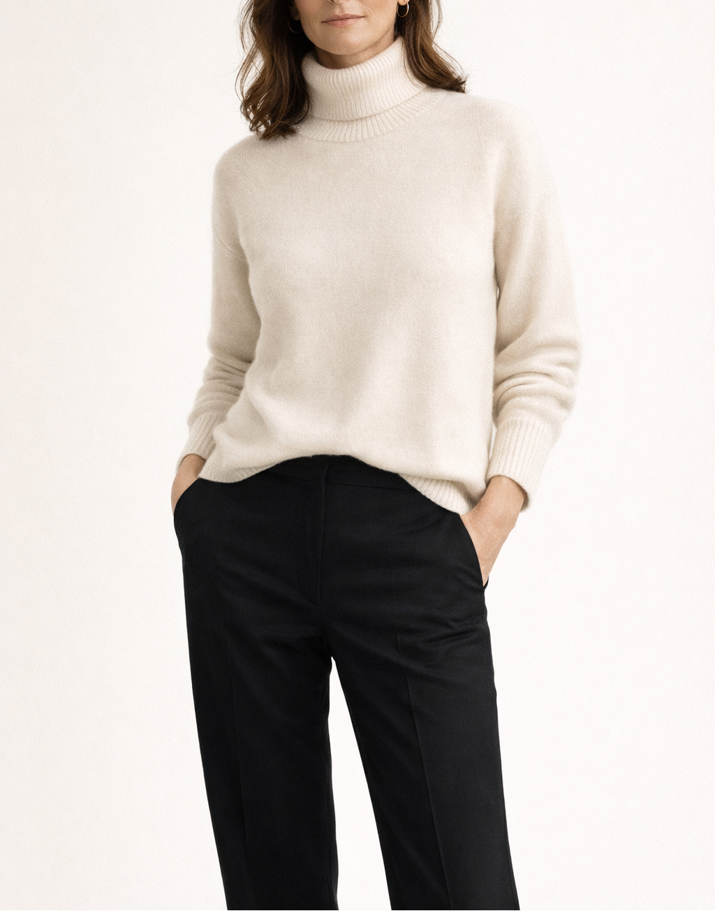 Un jersey de tejido suave con cuello alto, de aspecto tranquilo y refinado. La combinación de cachemira y lana garantiza una agradable y delicada sensación de calidez sobre la piel, mientras que el cuidado acabado mantiene una silueta atemporal. Diseñado para un estilo equilibrado, adecuado tanto para el día a día como para los entornos más formales.