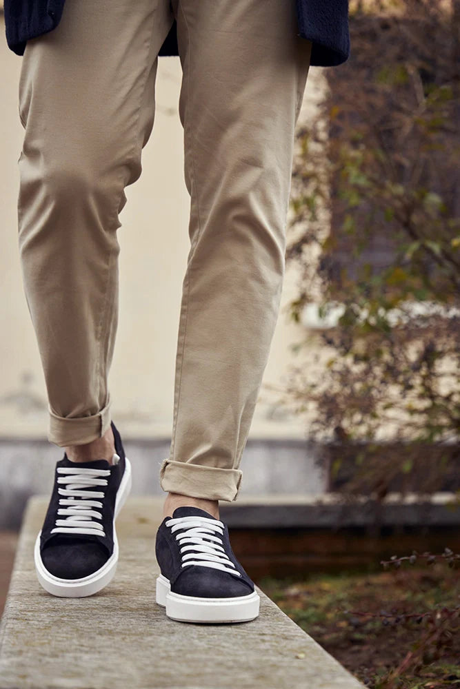 Mejora tu estilo con los zapatos Cefalù. Estos zapatos elevados añaden discretamente 6 centímetros a tu altura, lo que te da un impulso de confianza sin que nadie conozca tu secreto. Confeccionados en lujoso ante azul, combinan un aspecto deportivo con un diseño elegante, lo que los hace perfectos tanto para ocasiones informales como formales.